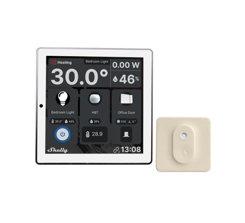 Et stilrent veggmontert touch-display som samler styringen av lys, varme, scener og smarthusfunksjoner på ett sted. Har innebygd temperatursensor, fuktighetssensor og støtte for Shelly-økosystemet. -